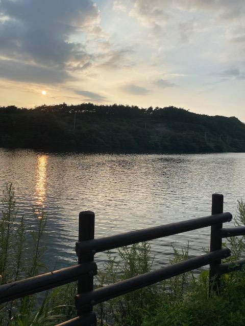 물과 산에 걸린 지는 해를 보자니