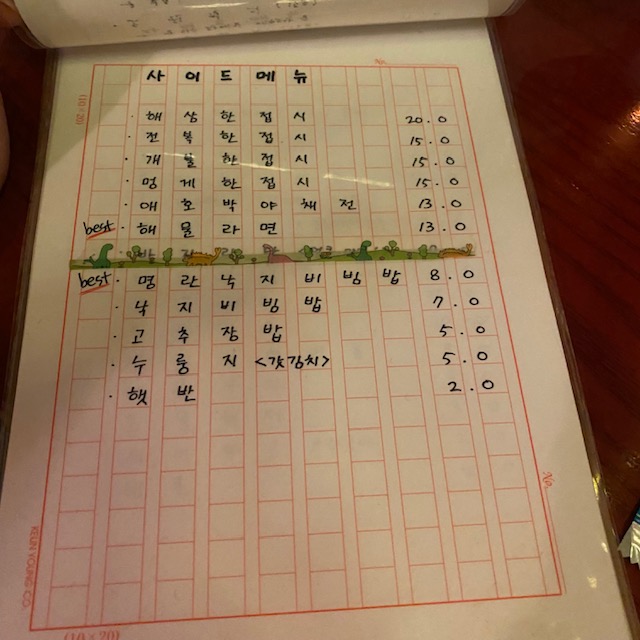 옛날 원고지에 쓴 메뉴들 ㅎㅎ
