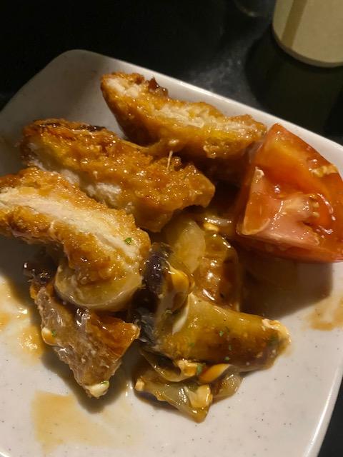 저 야채를 다 헤집어야 돈가스가 나온답니다.
