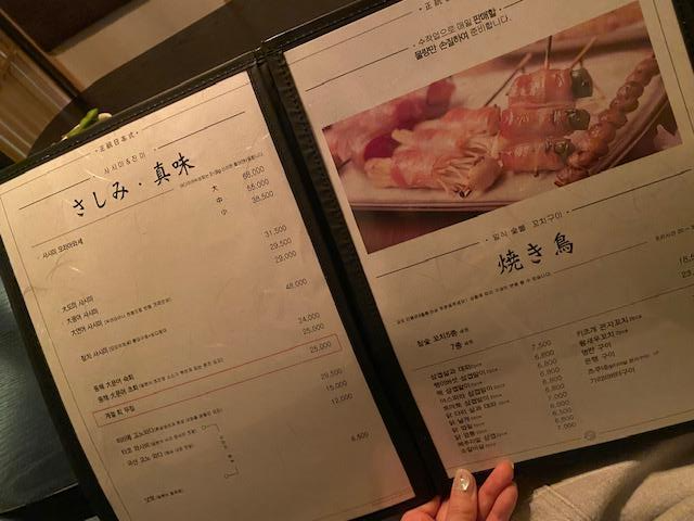 앞 쪽은 야키니꾸 소고기, 사시미, 꼬치 종류가 있어요.
